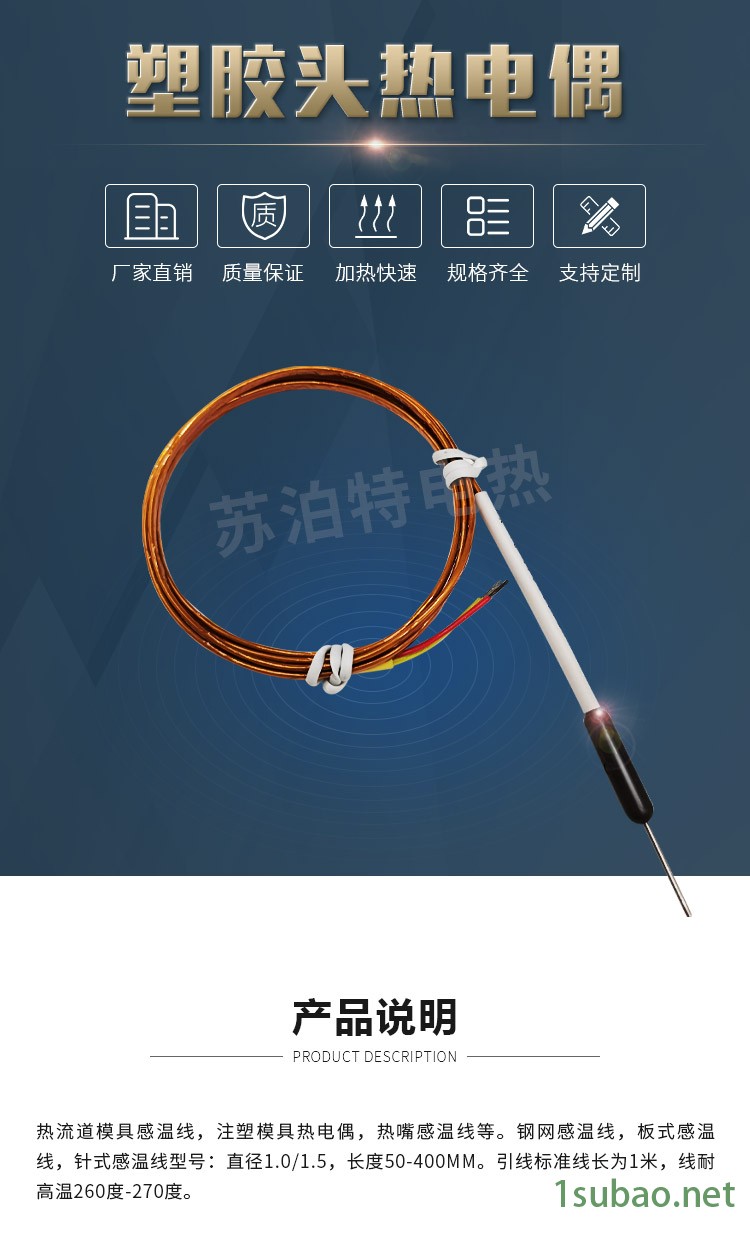 蘇泊特 廠家直供熱流道塑膠頭熱電偶鎧裝塑膠感溫線熱嘴熱電偶溫度傳感器